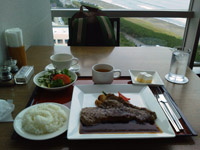 2013-07-17 レストラン亀楽亭 ランチ 亀田病院の人間ドックの後の食事は、亀田病院の13階にあるレストラン亀楽亭でのランチです。 病院内でこんな高カロリーのランチ食っていいのかなと思いつつ、朝食べていないので思いっきり豪華にステーキです。 レストラン亀楽亭から、海でサーフィンをしている人がいっぱい見えました。太平洋を望む景色は抜群です。