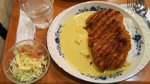 2019-03-05 PETIT LAPIN ランチ カレー 会社の誰かさんがカツカレーとキーマカレーが大好きと熱く語るので、お昼はカツカレーにしましょうとなりました。 今日のランチはPETIT LAPINのカツカレー850円 カレーが白くてビックリ。